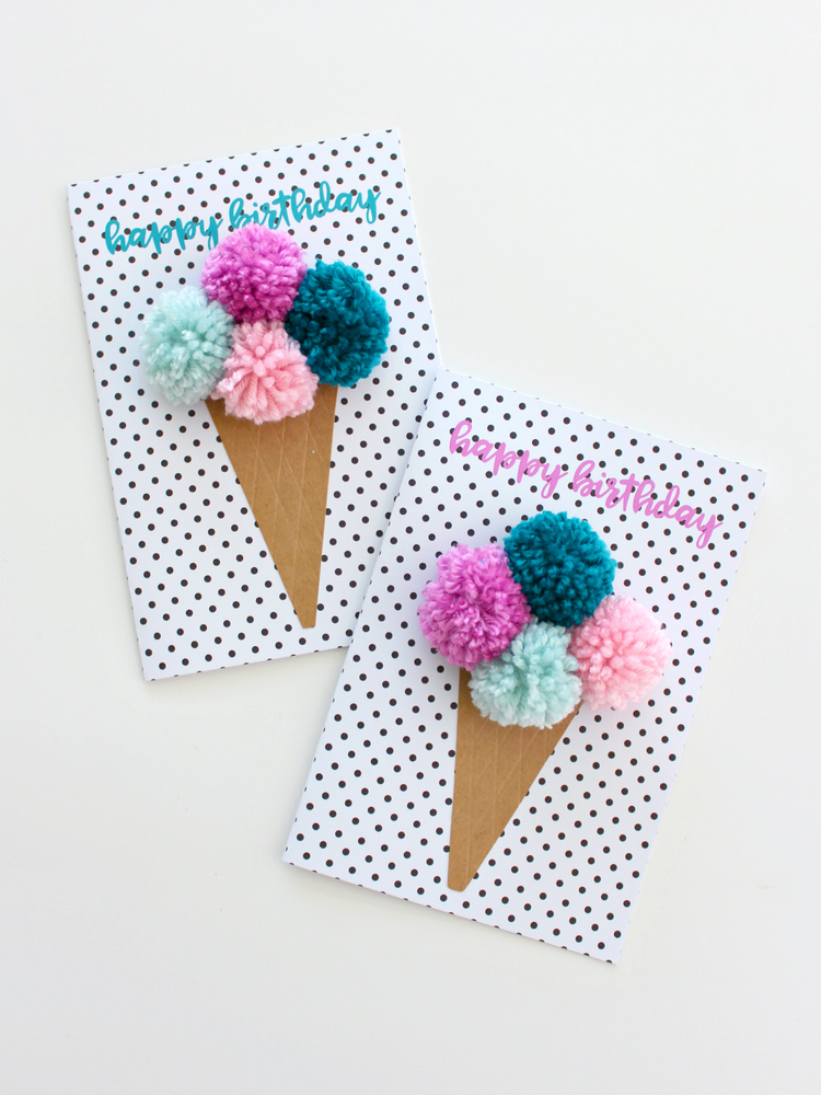 Pom pom crafts are great! Download the free printable 'Happy Birthday' background and then add in your pom pom scoops of ice cream.