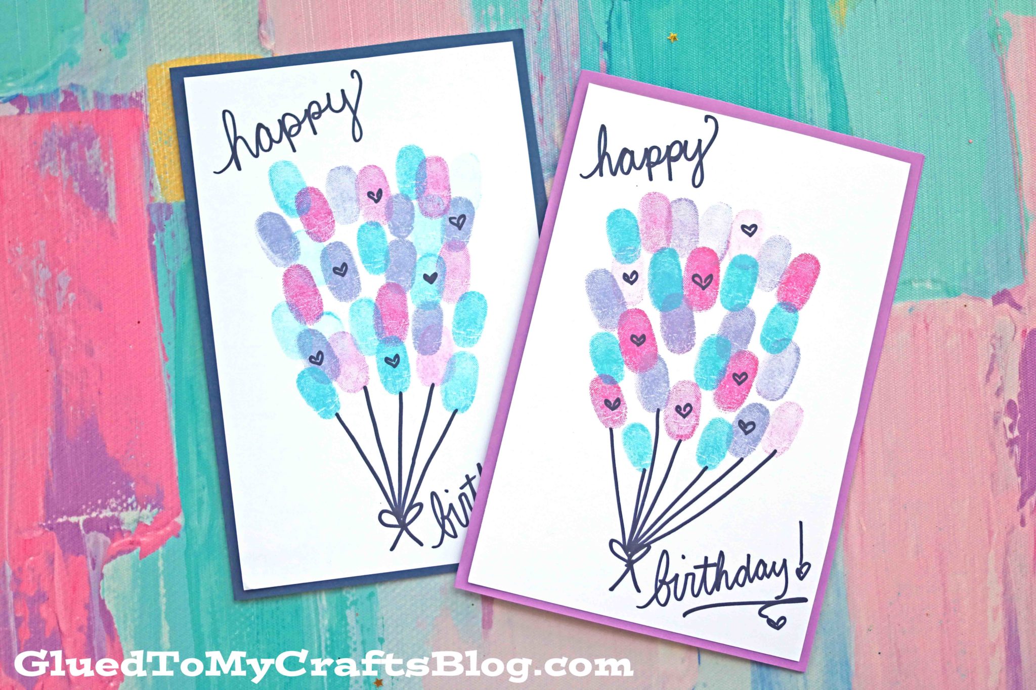 Cardstock paper, Sharpie markers and a few washable ink pads are the basis for this card. Get the kids involved by using their thumbprints for the balloons!