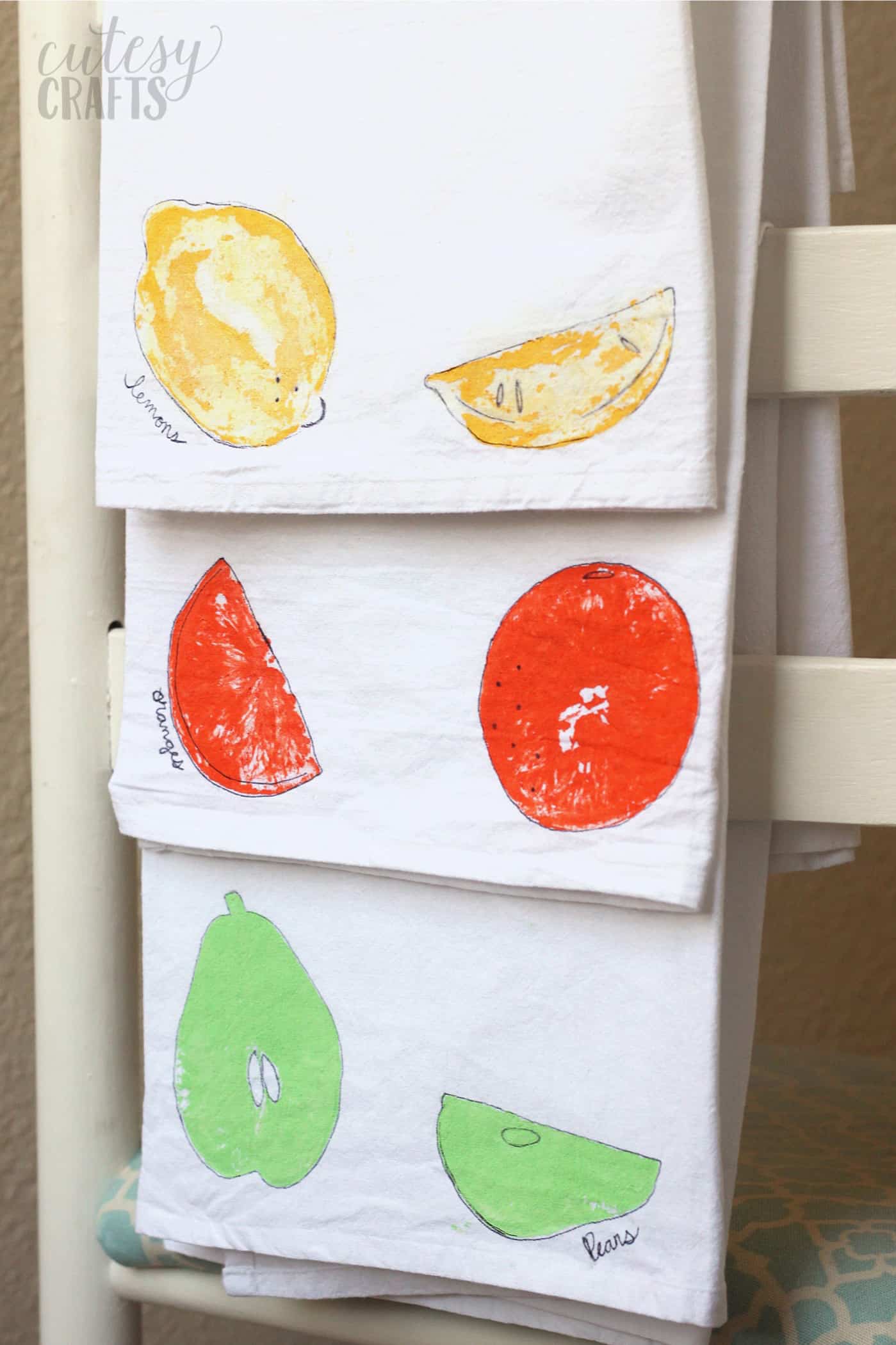 Use a fun fruit stamping technique to decorate some plain tea towels. These make great gifts and they are so easy – even a kid can make them!