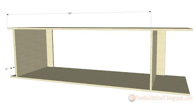 Attach the shelves and toe kick to 2 of the side pieces to form the first freestanding closet cabinet using wood glue and 1-1/4" Kreg screws