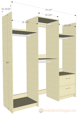 There are a lot of situations where you need additional closet space in a room. Older homes don't have large closets and some bedrooms may not have any closets at all if you're converting a den or study into a bedroom. This freestanding closet organizer provides ample room for hanging clothing, shelf space as well as 2 large drawers. It only needs 3 full sheets of 3/4" plywood and partial sheets of 1/2" and 1/4" to construct making it very affordable for the amount of storage you get.Four of these Amazon Basics Fabric Storage Bins fit nicely on the top.