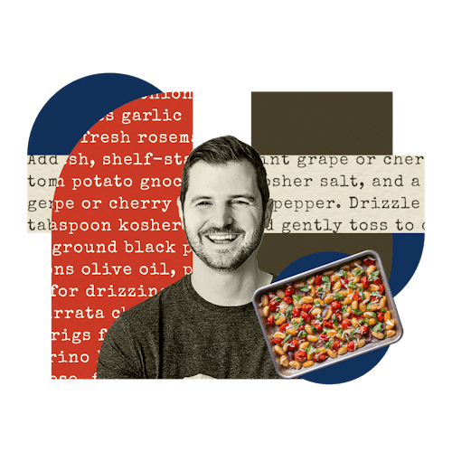 Unsurprisingly, Freeman chose a pasta dish to share for his “Dad Special” that’s inspired by his family: Sheet-pan Caprese Gnocchi. A quick, flavorful weeknight meal, it comes together in about 20 minutes. Shelf-stable gnocchi and garlicky cherry tomatoes are roasted in the oven before being mixed with basil, mozzarella, and balsamic dressing. The gnocchi crisp up and the tomatoes become jammy; the basil, balsamic, and cheese bring it together. It’s simple, refreshing, and perfect for the season.