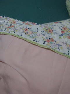 I just took a photo of the top edge before I hung them up. The green gingham bit was a surprise to me. The more I worked with the floral fabric the more my head kept saying "There's a green gingham in your stash that would go sooo well with this!" and I kept thinking, "But I don't have green anywhere else in the room." "But that green gingham would be so pretty with the green in this floral bit..." So I pulled it out and made an edge to go under the edge of the border. It is pretty together. But I do think I'd like to do a narrower border on the inside edge of the curtains of the two materials together. It just won't be today or any time in the next week or so.