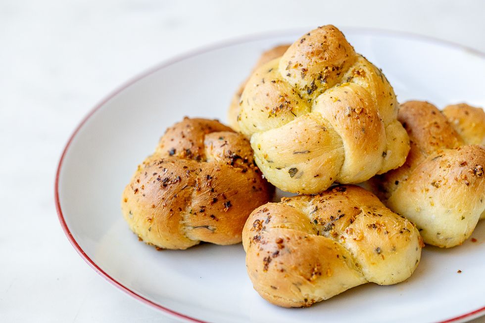 Baia's "old school" garlic knots are dense-but-chewy carb-y morsels seasoned with Italian herbs and garlic.