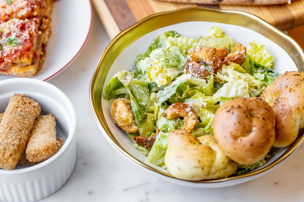 There are two salads on the menu, one antipasti with veggies and mozzarella and this classic caesar (hold the anchovies) with little gem lettuce and focaccia croutons.