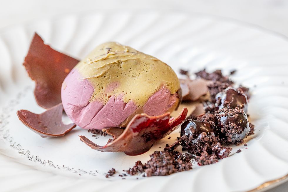 If you go with the spumoni, expect a next-level version of the classic frozen dessert. Instead of the usual gelato, chef Kenney molds together cherry, chocolate, and pistachio mousses and then encases them in a hardened dark chocolate shell. Crack it open and enjoy with a spoonful of amarena cherries.