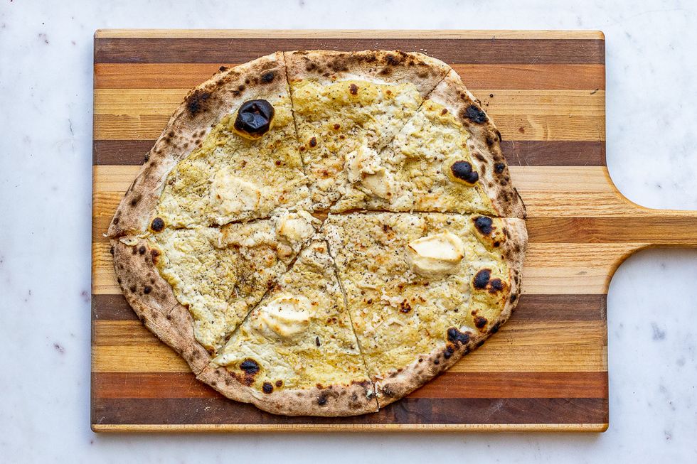 Since pizza is mostly about the crust, carnivores might not miss the meat here. Four pizza options include a classic Margherita and this cacio e pepe with all dairy-free mozzarella, cream, ricotta, and parmesan cheese topped with fresh black pepper. Gluten-free crust is also available.