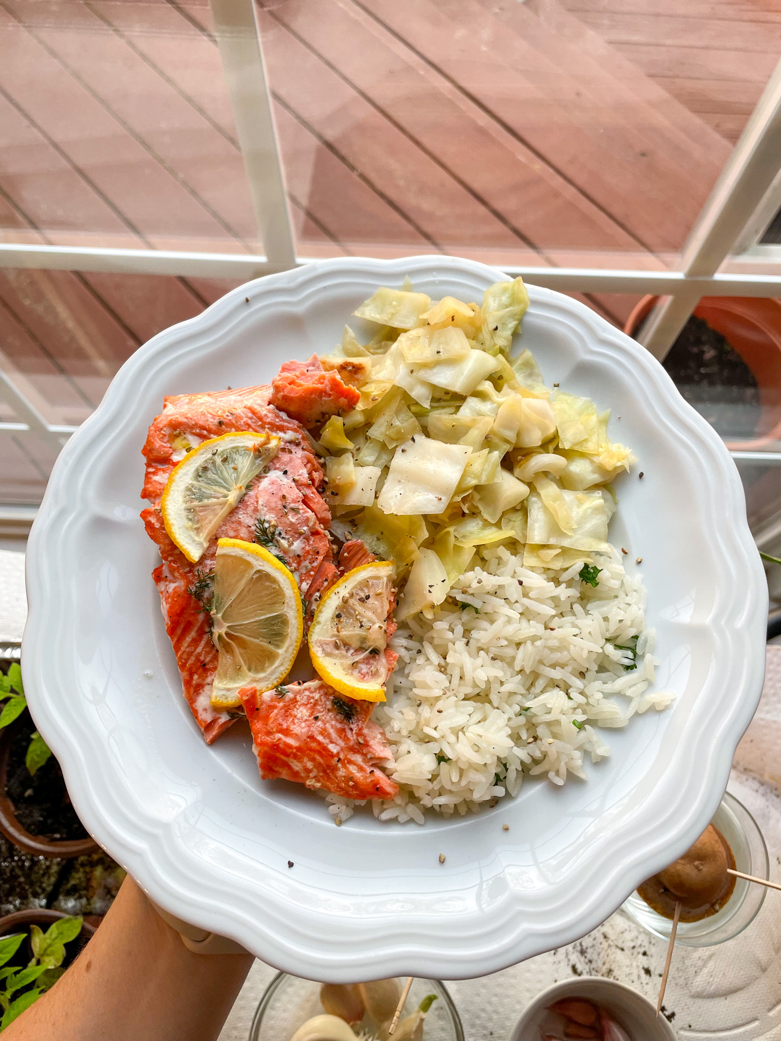 Mom and I were out all day for a shopping trip to celebrate her birthday! We got home later than we intended so I made a quick dinner of lemon dill salmon with rice made in the rice cooker and cabbage sauteed on the stove with olive oil, salt, and some red wine vinegar at the end.