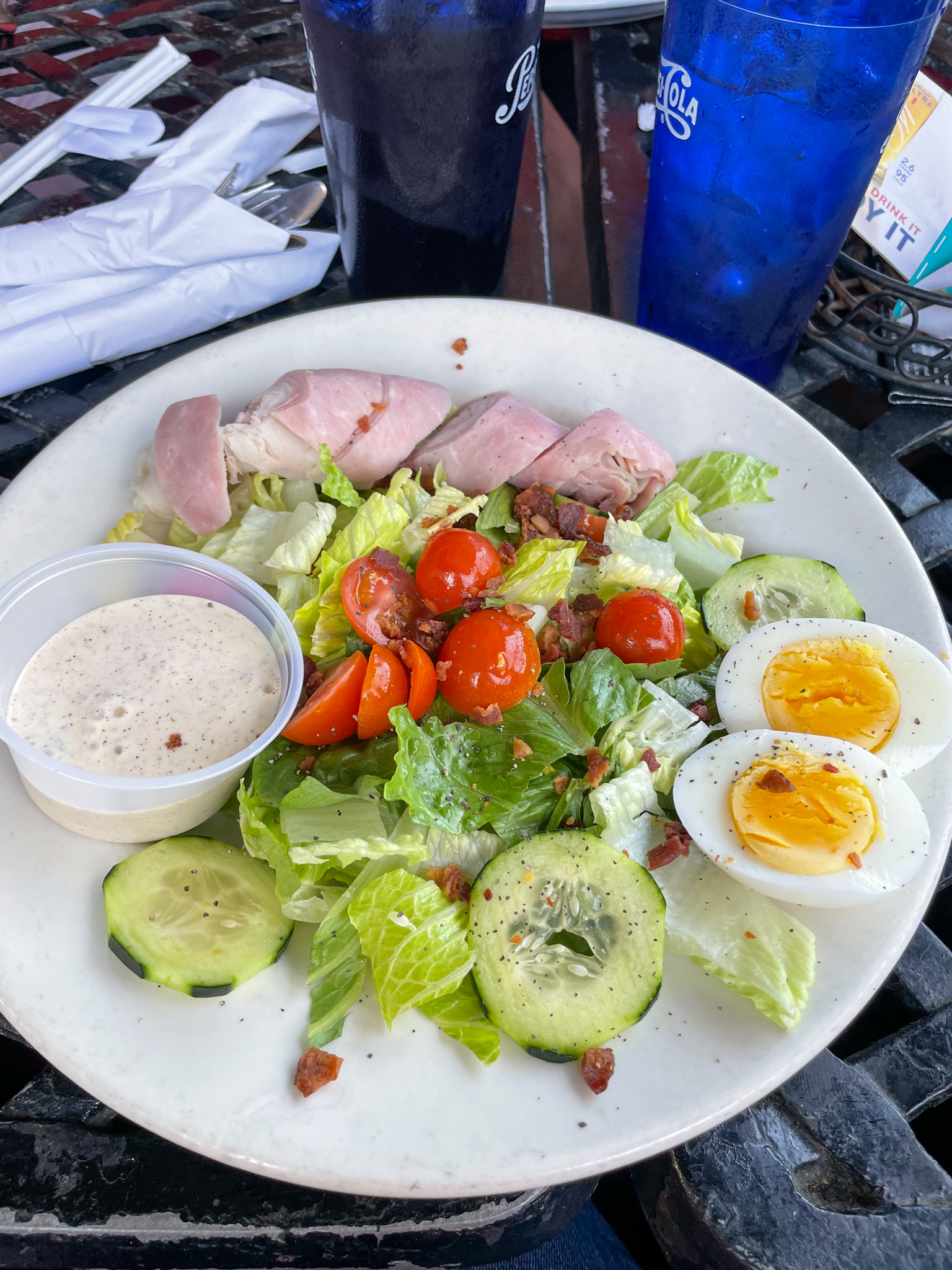 Saturday we were in South Carolina for the day and had dinner with David’s parents in Traveler’s Rest at Whistle Stop. We had eaten a large, hearty, delicious lunch at Chicora Alley in Traveler’s Rest so I wasn’t very hungry. I ordered the club salad. The chipotle ranch it came with was really good.