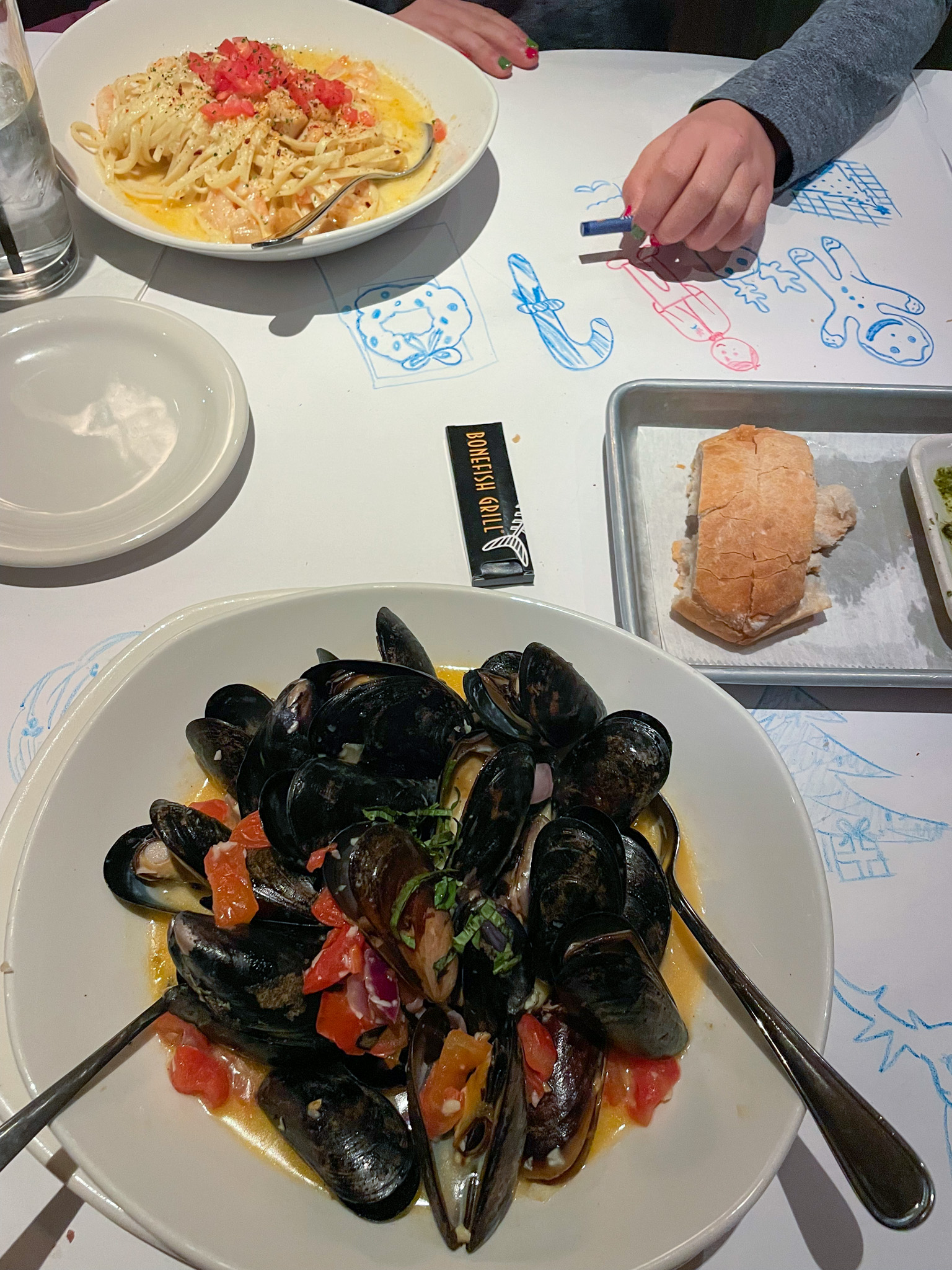 Let’s back up to the weekend. Friday we partook in one of our favorite Christmas tradition- family team shopping! We’ve done this for years and one of the nights we look forward to the most. This year Kaitlyn and I were paired up. We parked at Birkdale Village, an outdoor mall with all kinds of shops and festive decorations. Each team took a set budget and had 1.5 hours to shop for the other team. We ended the evening with the kids’ request- dinner at Bonefish Grill so we could have a family drawing contest on their paper tablecloths. Huge success of an evening!