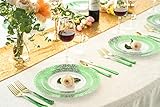 FOMOICA - Safe and durable these hard dinnerware party accessories are made from premium quality highly durable and safe plastic guaranteed to withstand the test of time The material is 100 nontoxic and foodgrade while being easy to clean if you decide to reuse them Complete set this fancy green gold plastic silverware and green white plastic plate set includes no less than 125 pieces everything youll need for the complete party planning experience Youll receive reusable 25 dinner plates 25 dessert plates 25 forks 25 spoons and 25 knives