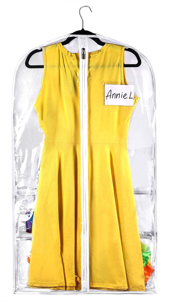 Keep costumes, dance wear, and dress clothing neatly protected and organized with clear, hanging garment bags with multiple storage pockets.