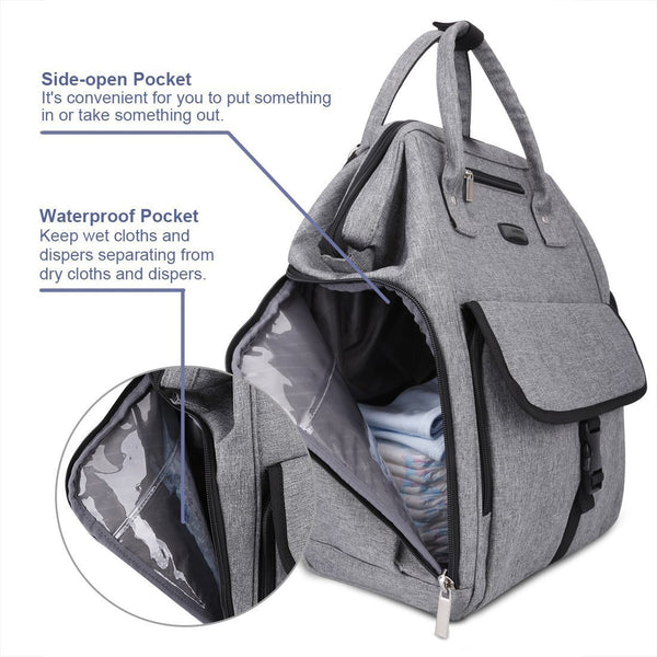 Wet cloth or diapers can be put in the waterproof pocket separated from dry cloths and diapers.